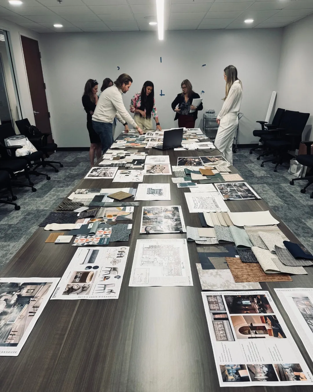 This presentation would include: plans, reflected ceiling design intent, elevations, material selections, finish selections, fabric palette, and key FF&E/decorative lighting design intent.